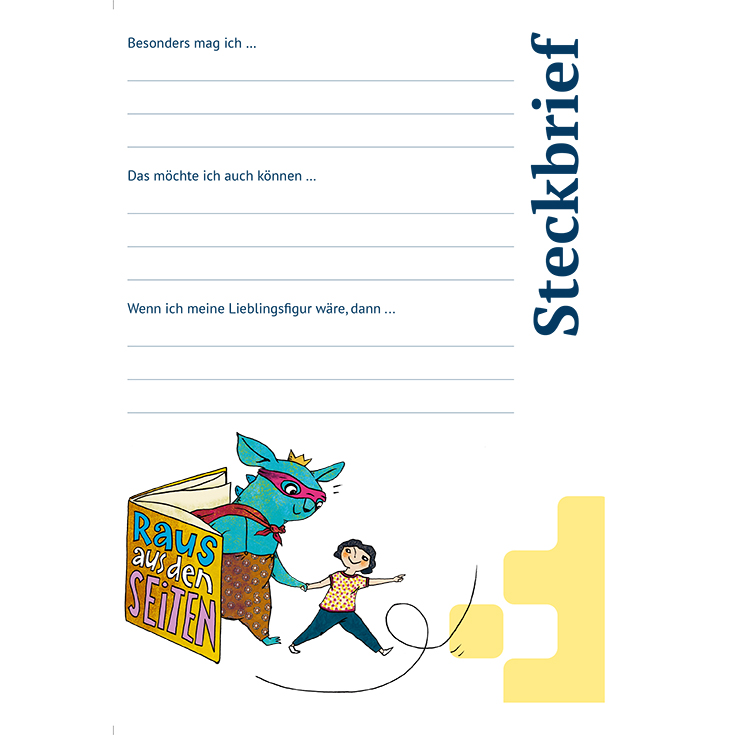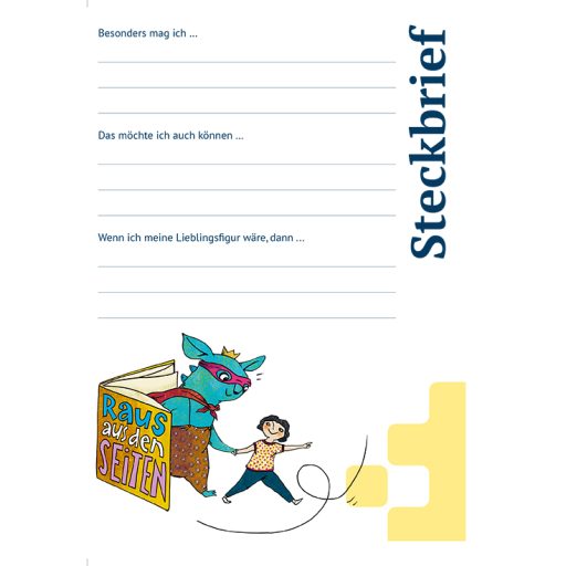 Die Plakate könnt ihr zur Bewerbung eurer Veranstaltungen zur Lesemotivation einsetzen. Mit den Steckbriefen haben die jungen Bibliotheksnutzer:innen die Möglichkeit, ihre Lieblingsfigur vorzustellen und damit andere Kinder für diese Medien zu begeistern.